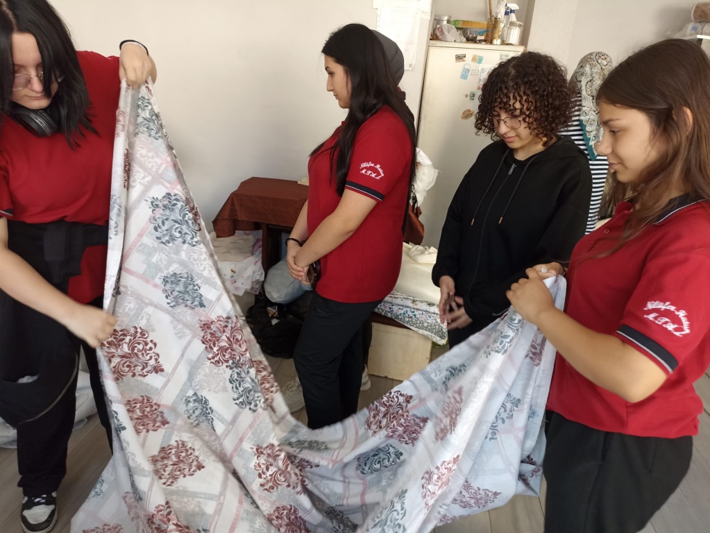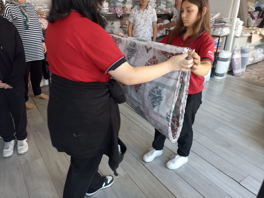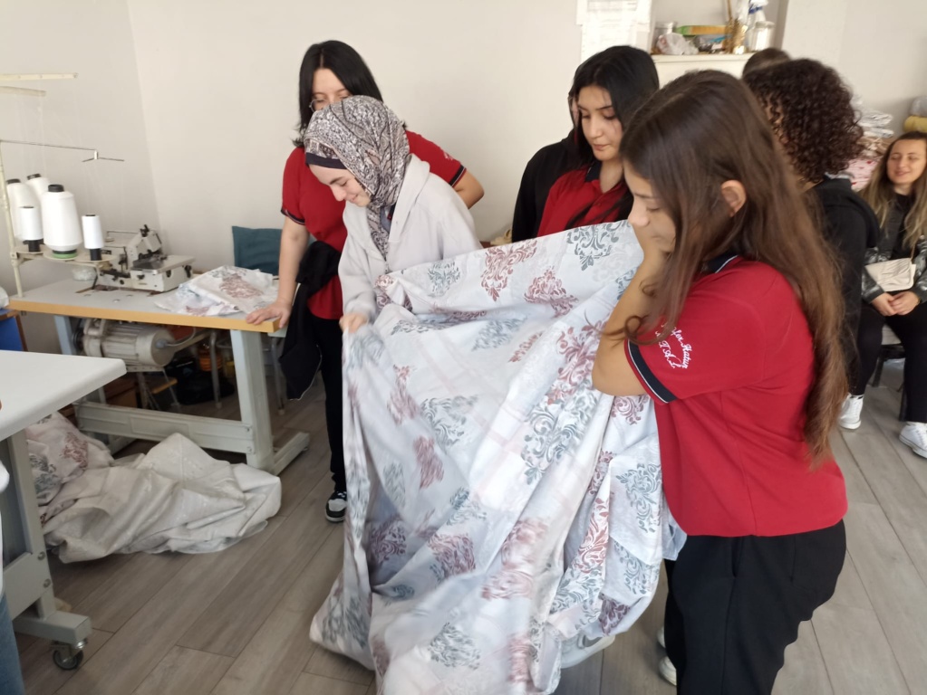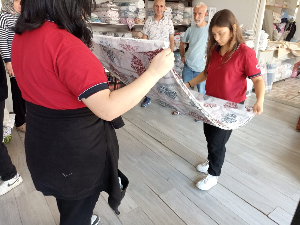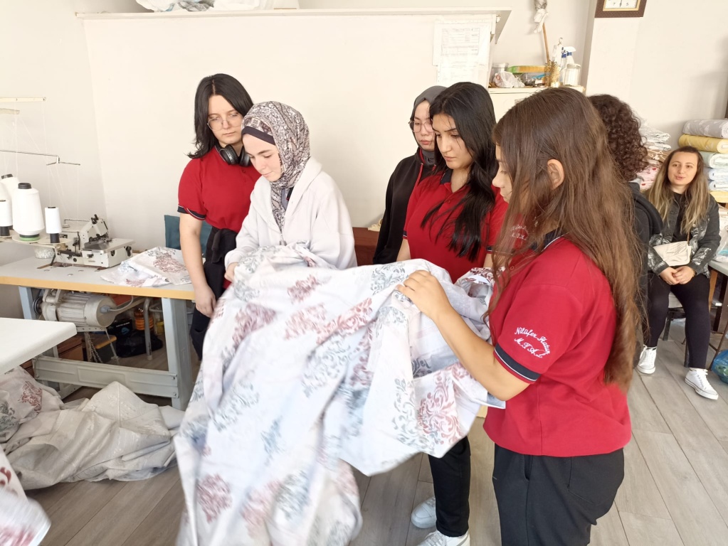 Okulumuz 11-E sınıfı Moda Tasarım Teknolojileri Alan öğrencileri Ev Tekstil Tasarım ve Üretim dersi kapsamindaki Nevresim Takımı Dikimi konusunu ilçemizde bulunan tesktil atölyesinde uygulamalı olarak görmüşler ve kendi dikecekleri nevresim takımı için kumaşlarıni almışlardır.